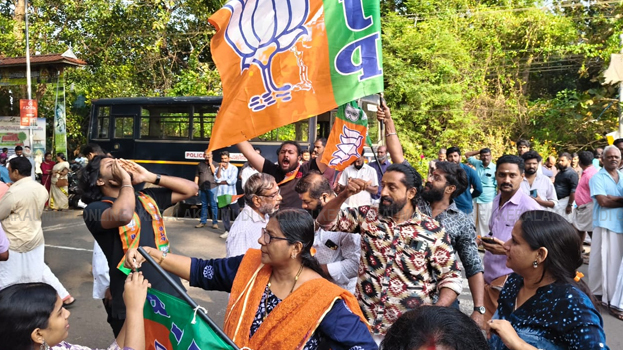 തൃശൂർ കോർപറേഷൻ പൂങ്കുന്നം ഡിവിഷനിൽ വിജയിച്ചതിന് പിന്നാലെ എൻഡിഎ പ്രവർത്തകരുടെ ആഹ്ലാദ പ്രകടനം.