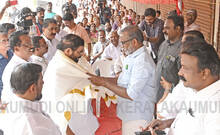 ഏറ്റുമാനൂർ നിയോജക മണ്ഡലം എൽ.ഡി.എഫ് വികസന സന്ദേശ ജാഥ പേരൂരിൽ ഉദ്ഘാടനം ചെയ്ത മന്ത്രി പി.പ്രസാദ് ജാഥ ക്യാപ്ടൻ മന്ത്രി വി.എൻ വാസവനെ സ്വീകരിക്കുന്നു