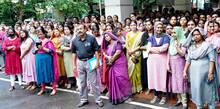 ശബരിമലയിലെ സ്വർണകൊള്ളക്കെതിരെ മഹിളാമോർച്ച നടത്തിയ സെക്രട്ടേറിയറ്റ് മാർച്ചിന്റെ ഭാഗമായി നടന്ന പ്രതിഷേധത്തിൽ അകപ്പെട്ട വനിതാ പൊലീസ് ഉദ്യോഗസ്ഥക്ക് ദേഹാസ്വാസ്ഥ്യം അനുഭവപ്പെട്ടപ്പോൾ സഹപ്രവർത്തകർ കുടിവെള്ളം നൽകുന്നു.