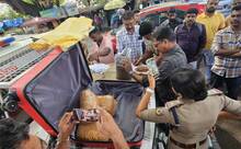 കൊല്ലം-തിരുപ്പതി എക്സ്പ്രസ് ട്രെയിനിൽ കൊല്ലത്തേക്ക് കൊണ്ട് വന്ന കഞ്ചാവ് പൊലീസ് പിടികൂടി പരിശോധിക്കുന്നു