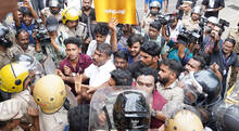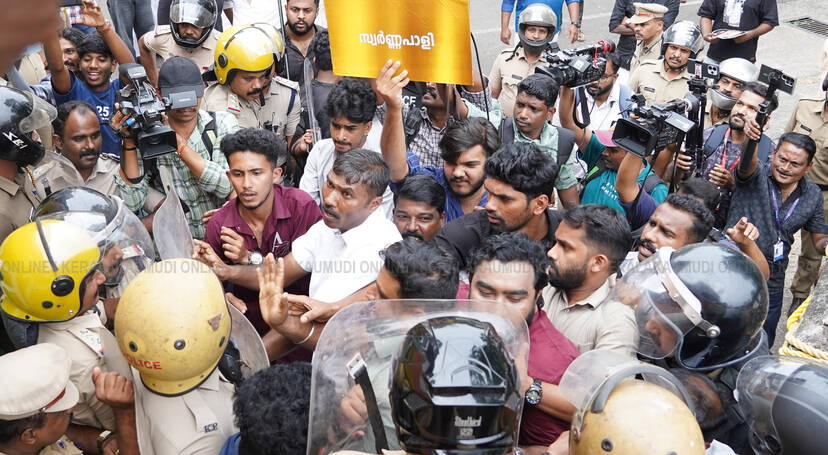 ശബരിമല സ്വർണക്കൊള്ള കേസിൽ മുൻ ദേവസ്വം മന്ത്രി കടകംപള്ളി സുരേന്ദ്രൻ അടക്കമുള്ള മന്ത്രിമാരുടെ പങ്ക് പുറത്ത് കൊണ്ടുവരണമെന്ന് ആവശ്യപ്പെട്ട് യൂത്ത് കോൺഗ്രസ് കോട്ടയം ജില്ലാ കമ്മിറ്റിയുടെ നേതൃത്വത്തിൽ തിരുനക്കരയിലെ തിരുവിതാംകൂർ ദേവസ്വം ബോർഡ് ഓഫീസിന് മുന്നിലേക്ക് നടത്തിയ മാർച്ചിൽ ബാരിക്കേഡ് തകർത്ത് അകത്ത് കയറാൻ ശ്രമിച്ച പ്രവർത്തകരെ പൊലീസ് തള്ളി മാറ്റുന്നു
